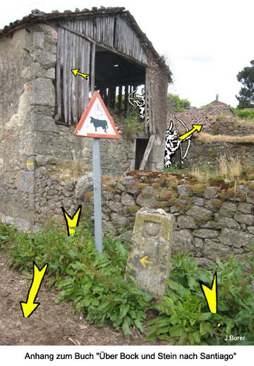 | Fluchtversuch eines Tintenfischs in Mélide | Gefährliche Kühe bei Boente | Nach der Beichte musste ein Pilger sein Souvenir nach Roncesvalles zurücktragen. |