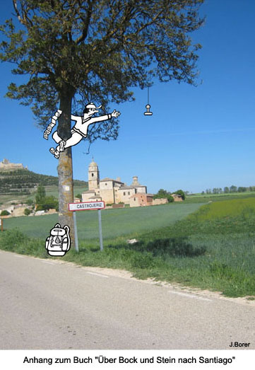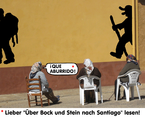 | Sonnenhungriger Pilger in Burgos | Spezieller Pilgerstempel vor Castrojeriz | Bettwanzen-Warntafel vor Frómista |