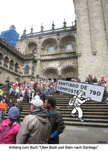 Inhaltsverzeichnis Vorwort Die Jakobsmuschel Lageplan und Höhenprofil Müder Start in Saint-Jean-Pied-de-Port Erste Schnarcher in Valcarlos Regenbogen über Roncesvalles Die königliche Familie in Zubiri Stierlauf-Training in Pamplona Die Bettgeschichte begann auf dem Perdón Ein Geisterfahrer vor Lorca Zitronengesichter am Weinbrunnen von Irache Ein Nähkurs in Viana Seitensprünge in Logroño In Najéra lag nicht nur das Geld auf der Strasse Nur Federvieh hatte Zutritt in Santo Domingo Gestörte Sonntagsruhe in Belorado Junge und alte Knochen in Atapuerca Als Luxus-Pilger in Burgos Zwei Hornochsen in Hornillos Ballermann in Castrojeriz Alkoholfreier Jakobsweg Verlobungsfeier in Frómista Die Pilgerautobahn nach Carrión de los Condes Lady goes to Ledigos Mit dem letzten Euro nach Sahagún Zwei Tote vor Reliegos Mit letzter Kraft nach León Glücksfall San Martín del Camino Polizeikontrolle vor Astorga Hundekampf in Foncebadón Meine kleine Familie am Cruz de Ferro Der lange Weg nach Villafranca del Bierzo Mit einem Virus nach Trabadelo Mit Bananen auf den O Cebreiro Im Schneegestöber nach Triacastela Absturz in Sarria Endlich auf der Treppe von Portomarín Im Pilgerstrom nach Palas de Rei Achtarmige Wegelagerer in Mélide Geisterstunde in Pedrouzo Nasser Einmarsch in Santiago de Compostela Statt in Finisterre - Landung in Genf Nachtrag